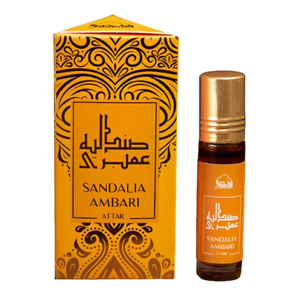 Attar Sandalia Ambari  is a majestic blend that unites the creamy elegance of sandalwood with the comforting warmth of vanilla and sweet balsamic benzoin. This attar exudes a rich, glowing aura that is both soothing and luxurious