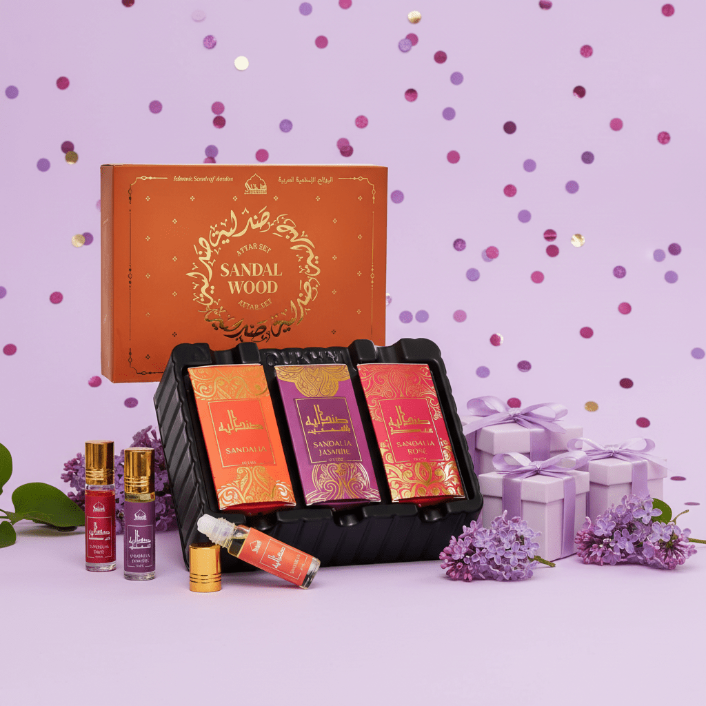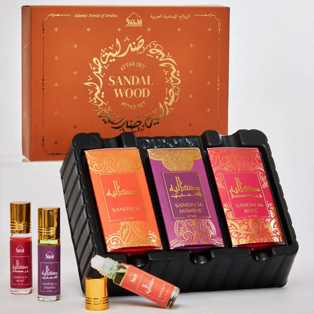 Gift Set includes 3 attar oils x 6ml : Sandalia, Sandalia Rose, Sandalia Jasmine.